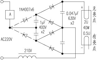 该直流灯使灯管与原镇流器已不配套,附图中仍用40W镇流器,此时电流表指示近0.6A,用30W镇流器时近0.5A,用20W时为0.41A左右。为了减小铜损仍用40W镇流器,将其中的垫纸减到0.15mm厚,即减小气隙而提高使用铁心Bm值,此时电流表指示为0.41A。但这时的镇流器自耗大,与灯管使用20W的镇流器温升相同。
