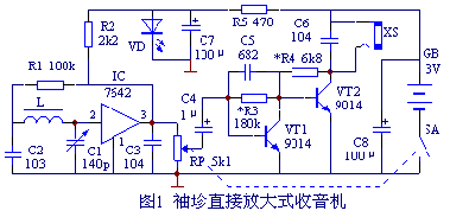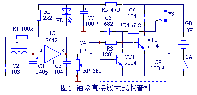 TA7642的后面又接了两级低放,由VT1、VT2组成。VT2的集电极接耳机BE,将低频电流转换为声音。电位器RP用来控制音量的大小。R5与发光二极管VD组成,简单的稳压电路,取得1.8V的稳定电压,供TA7642。