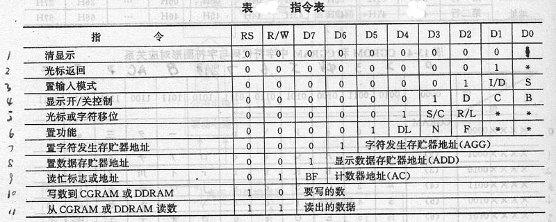 它的读写操作、屏幕和光标的操作都是通过指令编程来实现的。(说明:1为高电平、0为低电平) 指令1:清显示,指令码01H,光标复位到地址00H位置 指令2:光标复位,光标返回到地址00H 指令3:光标和显示模式设置 I/D:光标移动方向,高电平右移,低电平左移 S:屏幕上所有文字是否左移或者右移。高电平表示有效,低电平则无效 指令4:显示开关控制。 D:控制整体显示的开与关,高电平表示开显示,低电平表示关显示 C:控制光标的开与关,高电平表示有光标,低电平表示无光标 B:控制光标是否闪烁,高电平闪烁,低电平不闪烁 指令5:光标或显示移位 S/C:高电平时移动显示的文字,低电平时移动光标 指令6:功能设置命令 DL:高电平时为4位总线,低电平时为8位总线 N:低电平时为单行显示,高电平时双行显示 F: 低电平时显示5x7的点阵字符,高电平时显示5x10的点阵字符 指令7:字符发生器RAM地址设置 指令8:DDRAM地址设置 指令9:读忙信号和光标地址 BF:为忙标志位,高电平表示忙,此时模块不能接收命令或者数据,如果为低电平表示不忙。 指令10:写数据 指令11:读数据