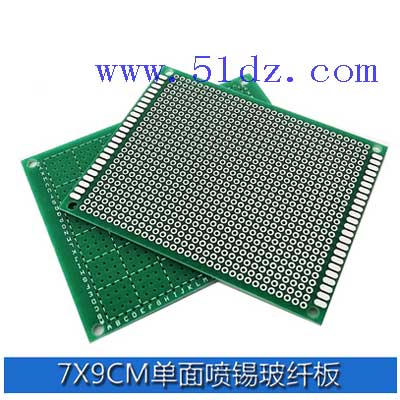 单面喷锡玻纤板7*9cm,70mm×90mm,板厚1.6mm,绿油和白字。 特别是电子爱好者和产品开发者在制作电路或者研制样机时最理想的选择,批量价优,欢迎来电联系。