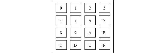 如图4.14.2所示,用AT89S51的并行口P1接4×4矩阵键盘,以P1.0-P1.3作输入线,以P1.4-P1.7作输出线;在数码管上显示每个按键的“0-F”序号。对应的按键的序号排列如图4.14.1所示