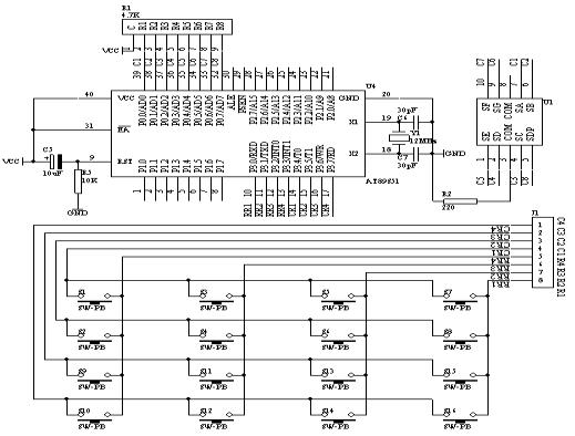 (2. 每个按键有它的行值和列值 ,行值和列值的组合就是识别这个按键的编码。矩阵的行线和列线分别通过两并行接口和CPU通信。每个按键的状态同样需变成数字量“0”和“1”,开关的一端(列线)通过电阻接VCC,而接地是通过程序输出数字“0”实现的。键盘处理程序的任务是:确定有无键按下,判断哪一个键按下,键的功能是什么;还要消除按键在闭合或断开时的抖动。两个并行口中,一个输出扫描码,使按键逐行动态接地,另一个并行口输入按键状态,由行扫描值和回馈信号共同形成键编码而识别按键,通过软件查表,查出该键的功能。