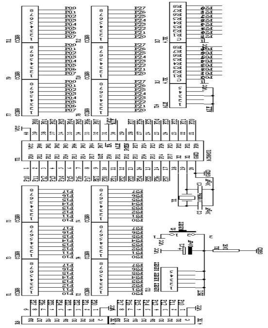 该系统板上的单片机系统把全部的I/O端口资源提供出来,因此,在实际应用的时候,可以灵活地组合成不同的单片机应用系统,该单片机采用12MHZ晶振,具体的电路原理图如图1.17所示: