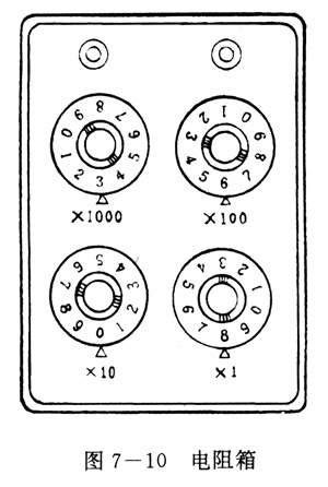图7-10是实验室用的旋盘式电阻箱.在它的面板上有两个接钱柱、四个旋盘.使用时,把两个接钱柱接入电路,调节四个旋盘就能得到0~9999欧之间的任意整数阻值.各旋对应的指示点(图中的小三角)的示数乘以面领上标记的倍数,然后加在一起,就是接入电路的阻值.图7-10所示电阻箱的示数为3608欧.