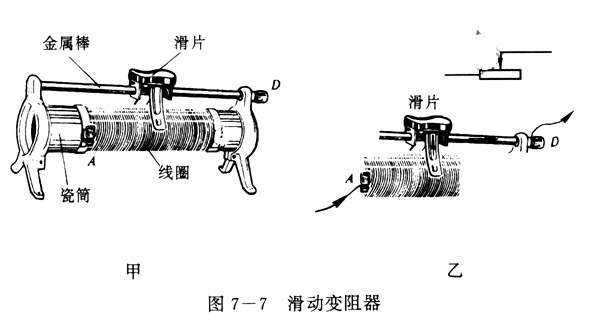 图7-7是实验室里常用的一种滑动变阻器.请你自己对照实物和图7-7,弄清滑动变阻器的构造、原理和用法.然后认真做图7一8的实验,学会使用滑动变阻器。