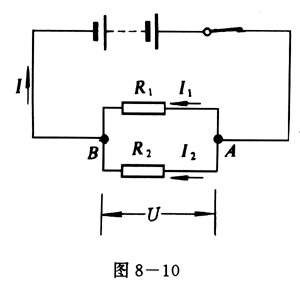 图8-10,设支路的电阻分别为R1和R2,电路两端的电压为U,根据欧姆定律,我们有: