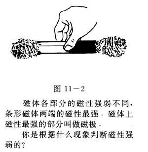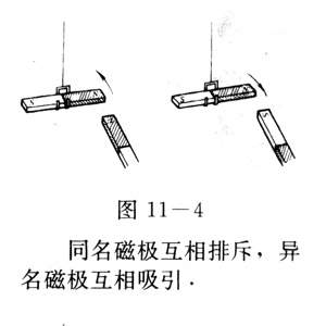磁铁吸铁,磁针指南北.这类简单孩现象你在小学自然课里已经学过了图11-1、图11-2、图11-3至图11-4所示的现象.可以帮助你回忆起学过的知识.